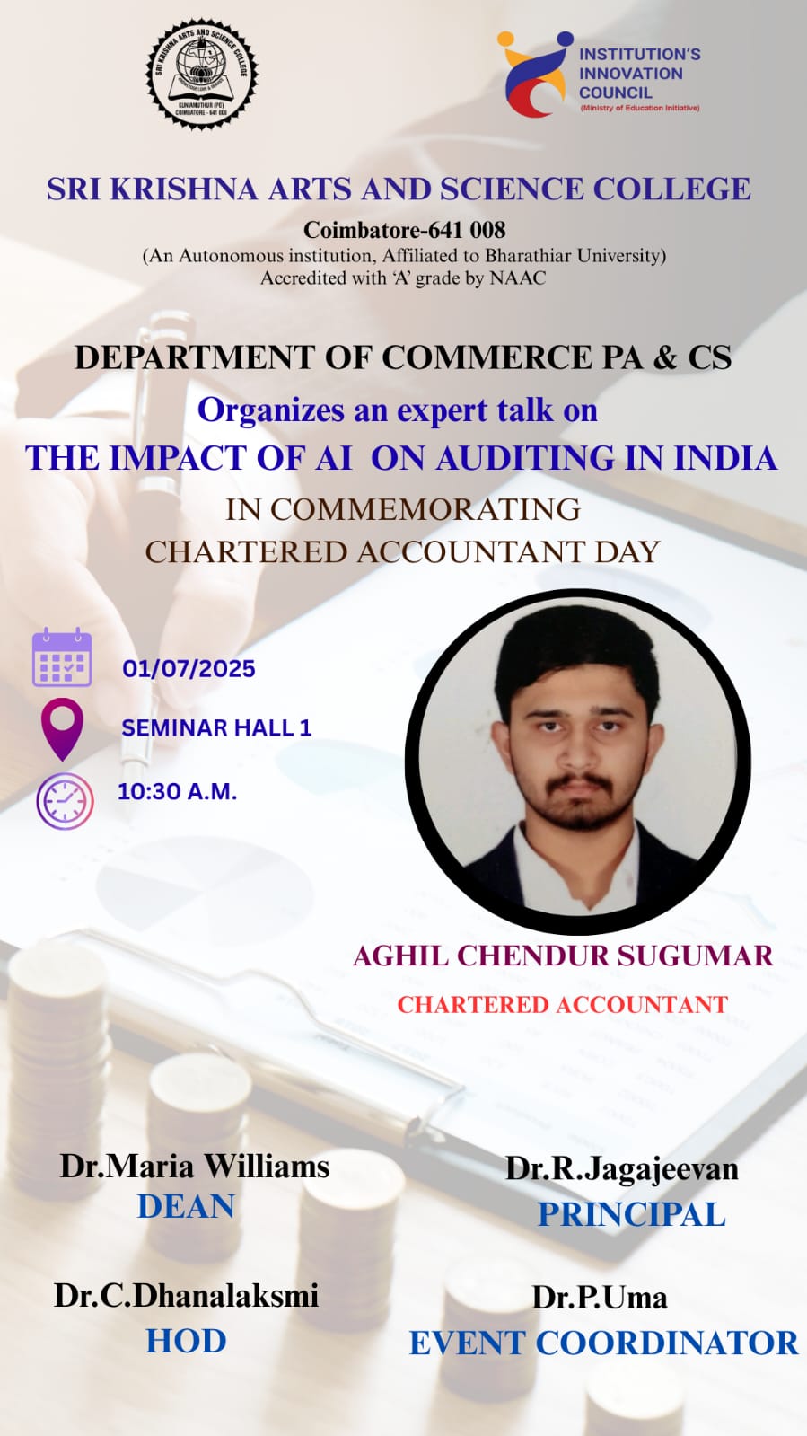 Guest lecture was conducted by the department of B.com PA & CS on 06.09.2024 from 2:00 pm to 4:00 pm. The chief guest CS C. Shakunthala, practicing chartered accountant, vice chair person of ICSI Coimbatore chapter , has taken a lecture on career development after the graduation especially for commerce students specialization with corporate secretaryship. The topic is relevant about the introduction of company secretary, jobs and duties of company secretary, roles and importance, and how it is developing in this current trend. The distinguished chief guest also motivated and encouraged us with her motivational words. The main objective of organizing this lecture was to understand the demand and scope of being a CA, CMA & CS.